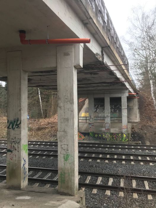 Na výzvu městské části došlo k otlučení nesoudržných částí mostu, aby nehrozil nekontrolovaný pád na projíždějící vlaky.