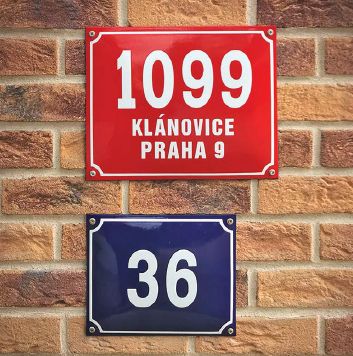 - modrá tabulka – pražský vzor: číslo ORIENTAČNÍ, jméno ulice.